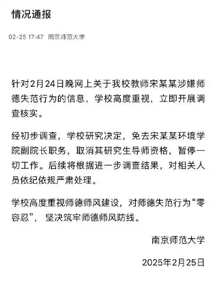 ·南京師范大學(xué)通報(bào)“副院長(zhǎng)被指出軌女博士”:免去副院長(zhǎng)職務(wù),取消研究生導(dǎo)師資格。
