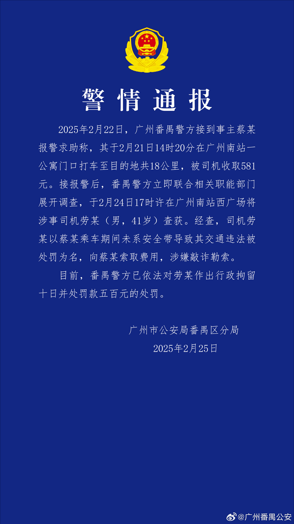 ·廣州警方通報(bào)乘客打車18公里被收581元:涉事司機(jī)行拘十日并罰款五百。
