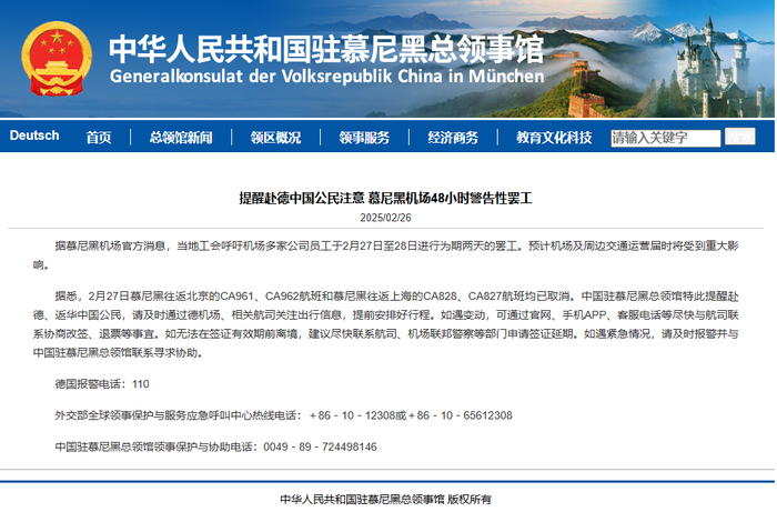 據(jù)悉,2月27日慕尼黑往返北京的CA961、CA962航班和慕尼黑往返上海的CA828、CA827航班均已取消。中國駐慕尼黑總領(lǐng)館特此提醒赴德、返華中國公民,請及時通過德機場、相關(guān)航司關(guān)注出行信息,提前安排好行程。如遇變動,可通過官網(wǎng)、手機APP、客服電話等盡快與航司聯(lián)系協(xié)商改簽、退票等事宜。如無法在簽證有效期前離境,建議盡快聯(lián)系航司、機場聯(lián)邦警察等部門申請簽證延期。如遇緊急情況,請及時報警并與中國駐慕尼黑總領(lǐng)館聯(lián)系尋求協(xié)助。