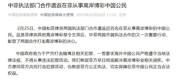 中國駐菲律賓大使館消息,2月25日,中國和菲律賓兩國執(zhí)法部門合作遣返近百名在菲從事離岸博彩的中國公民。這是菲律賓政府離岸博彩禁令生效后,中菲兩國開展執(zhí)法合作的又一次重要行動(dòng),彰顯了兩國合作打擊離岸博彩的決心。