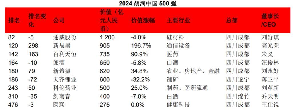 2月25日,胡潤研究院發(fā)布《2024胡潤中國500強》榜單,列出了中國500強非國有企業(yè)。按照企業(yè)價值排名,其中,四川有9家企業(yè)上榜,分別是通威股份、新易盛、百利天恒、郎酒、新希望、天齊鋰業(yè)、科倫藥業(yè)、劍南春、醫(yī)聯(lián)。