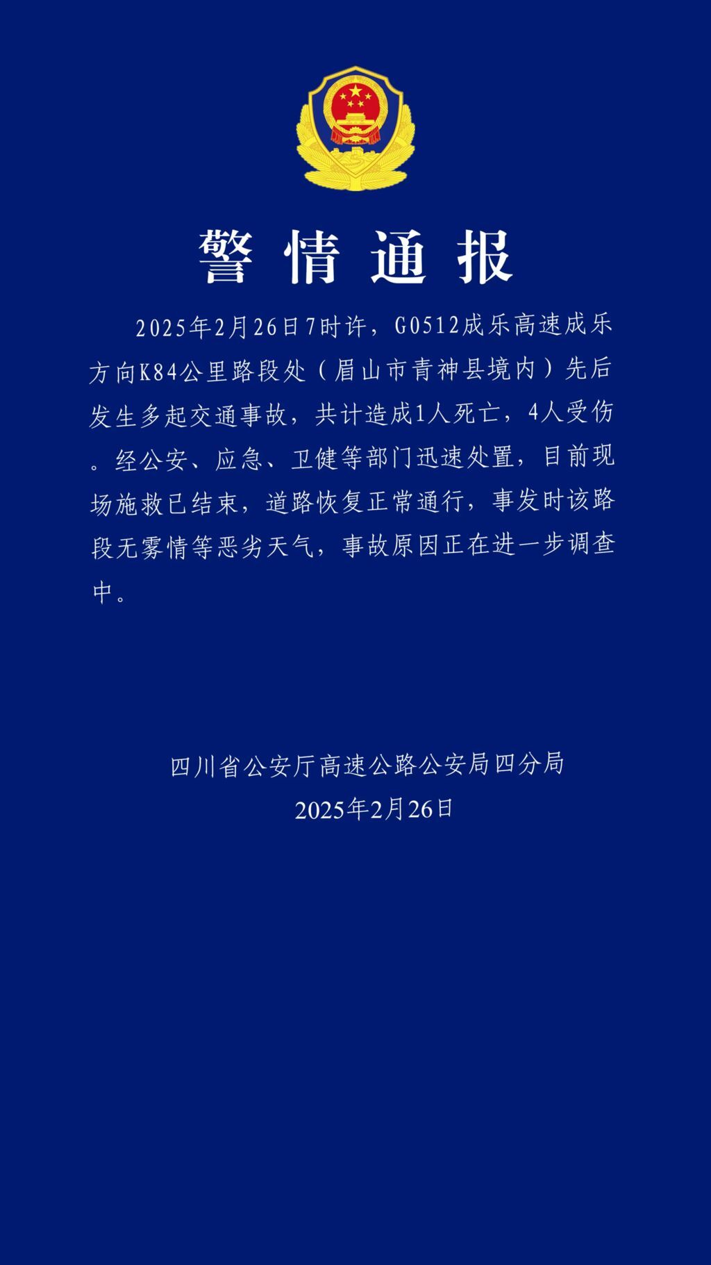 2月26日,四川省公安廳高速公路公安局四分局發(fā)布警情通報(bào)。當(dāng)天7時(shí)許,G0512成樂(lè)高速成樂(lè)方向K84公里路段處(眉山市青神縣境內(nèi))先后發(fā)生多起交通事故,共計(jì)造成1人死亡,4人受傷。
