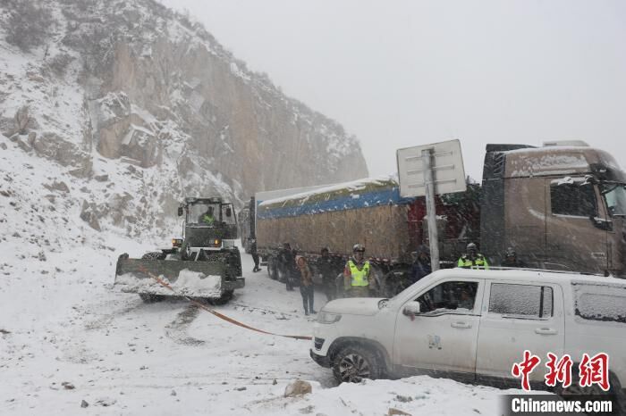 據(jù)了解,災(zāi)情發(fā)生后,擔(dān)負(fù)該路段養(yǎng)護保通任務(wù)的武警第二機動總隊某支隊官兵迅速啟動道路除雪保通預(yù)案,抽組專業(yè)救援力量及大型救援裝備趕赴受阻路段實施搶通。受阻路段平均海拔處于4000米以上,持續(xù)降雪不斷,官兵們首先對滯留人員進(jìn)行安撫,并發(fā)放食物和藥品等救援物資,為盡快清理路面積雪,官兵采取“機械協(xié)同先通后擴、人機配合高效救援”的方式同步展開作業(yè)。期間,一輛重載半掛車不慎陷入邊溝中,指揮員果斷調(diào)整方案,封控現(xiàn)場、撒布融雪劑、清理四周積雪、鋼絲繩牽引等步驟緊張有序的進(jìn)行中……伴隨著發(fā)動機的轟鳴聲,車輛被成功救出。