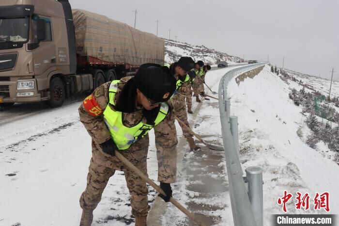 在嚴(yán)寒天氣里,武警官兵克服高寒缺氧的惡劣環(huán)境,累計清雪5500余立方米,解救滯留車輛200余輛,恢復(fù)道路暢通。(完)