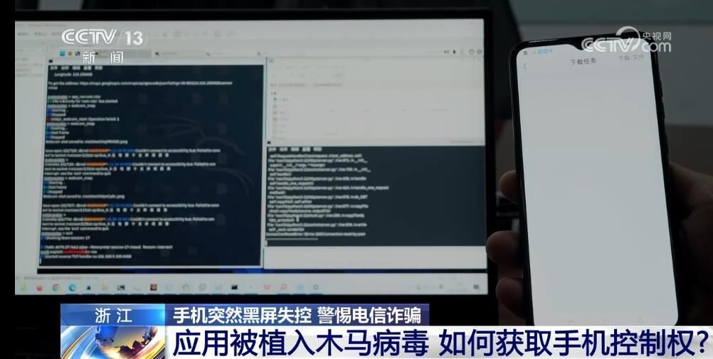 安信天行網(wǎng)絡(luò)安全工程師 陳青民:我們輸入一個命令,通訊錄的所有的信息會以一個文本的形式在控制者電腦上進(jìn)行顯示,我們就打開這個時候他手機(jī)里邊存的所有電話號碼,就掌握到犯罪團(tuán)伙手里邊了。下面我們展示一下如何去獲取手機(jī)的控制權(quán)?,F(xiàn)在我的手機(jī)不進(jìn)行任何操作,它在敲入命令之后自動打開了新的應(yīng)用程序,現(xiàn)在我的手機(jī)就不受控制了。