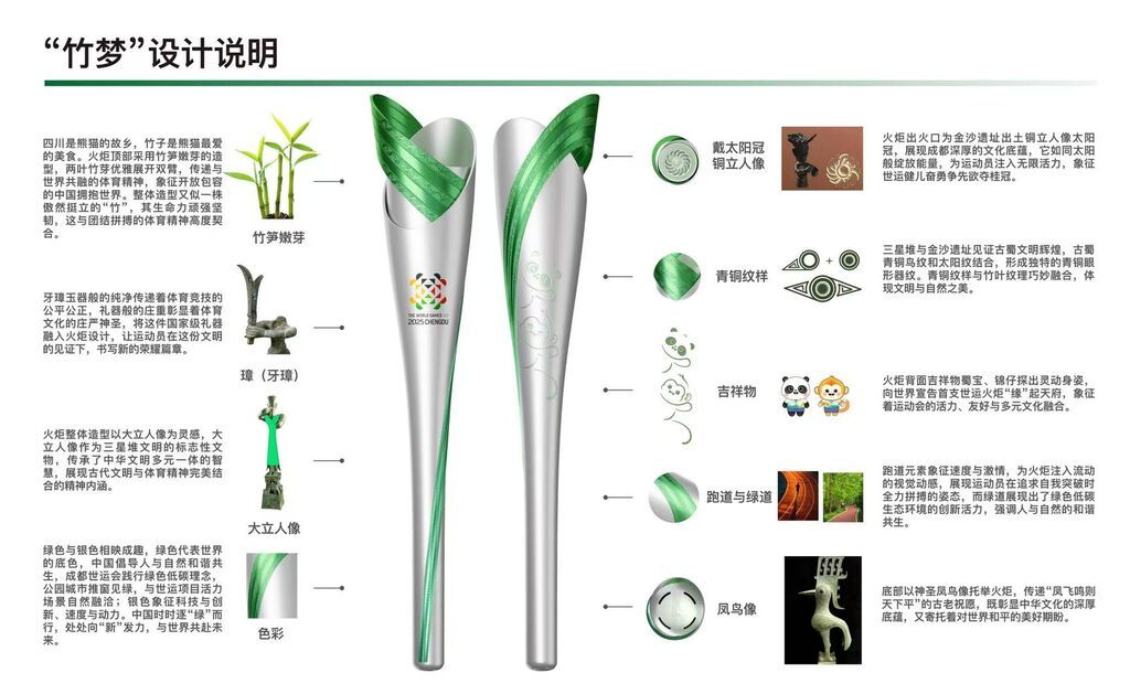 火炬的顏色是綠色與銀色,綠色代表世界的底色,中國(guó)倡導(dǎo)人與自然和諧共生,成都世運(yùn)會(huì)踐行綠色低碳理念,公園城市推窗見綠,與世運(yùn)項(xiàng)目活力場(chǎng)景自然融洽;銀色象征科技與創(chuàng)新、速度與動(dòng)力。中國(guó)時(shí)時(shí)逐“綠”而行,處處向“新”發(fā)力,與世界共赴未來。