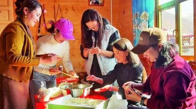 四川省甘孜州甘孜縣仁果鄉(xiāng)干部與該鄉(xiāng)桑都村村民一起做團(tuán)圓飯。賴紅攝/光明圖片