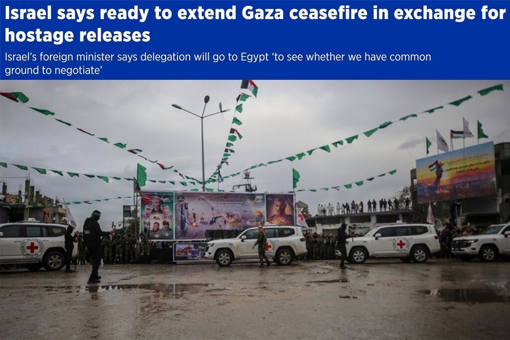 以色列外長(zhǎng)薩爾當(dāng)天表示,以色列準(zhǔn)備延長(zhǎng)加沙地帶?;饏f(xié)議第一階段的期限,以換取釋放更多被扣押人員。他同時(shí)強(qiáng)調(diào),以色列不接受哈馬斯的軍事存在。