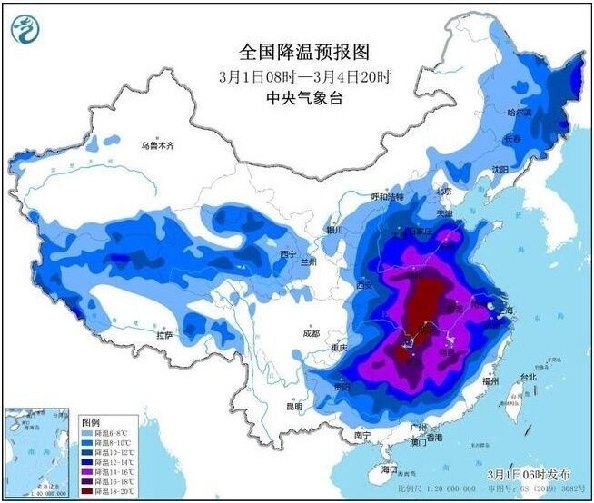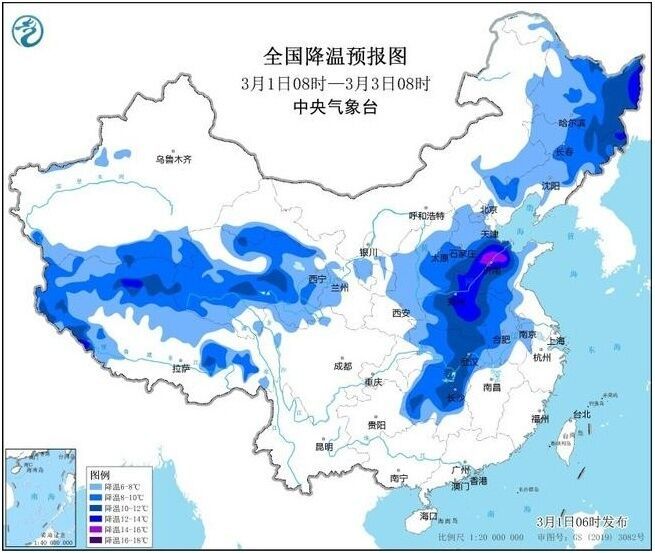 其中,預(yù)計,3月1日08時至3月3日08時,東北地區(qū)大部、華北中南部、黃淮大部、江淮西部、江漢、江南西部以及青藏高原北部和西部等地將降溫6℃~8℃,其中,黑龍江東部、吉林東部、華北南部、黃淮中西部、江漢、江南西部等地的部分地區(qū)降溫10℃~12℃,局地降溫幅度可達(dá)14℃以上。