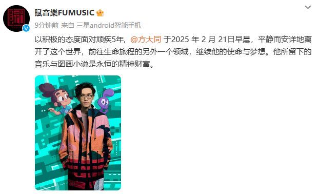 2025年3月1日,賦音樂(lè)有限公司發(fā)布消息:以積極的態(tài)度面對(duì)頑疾5年,方大同于2025年2月21日早晨,平靜而安詳?shù)仉x開(kāi)了這個(gè)世界,前往生命旅程的另外一個(gè)領(lǐng)域,繼續(xù)他的使命與夢(mèng)想。他所留下的音樂(lè)與圖畫小說(shuō)是永恒的精神財(cái)富。