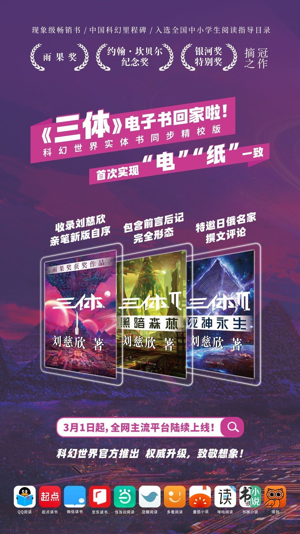 3月1日,中國(guó)科幻里程碑之作《三體》系列圖書的電子書版權(quán)正式回歸成都,重回它的誕生地——《科幻世界》。這標(biāo)志著《三體》在出版領(lǐng)域的全新征程,也為中國(guó)科幻產(chǎn)業(yè)的發(fā)展注入了新的活力。