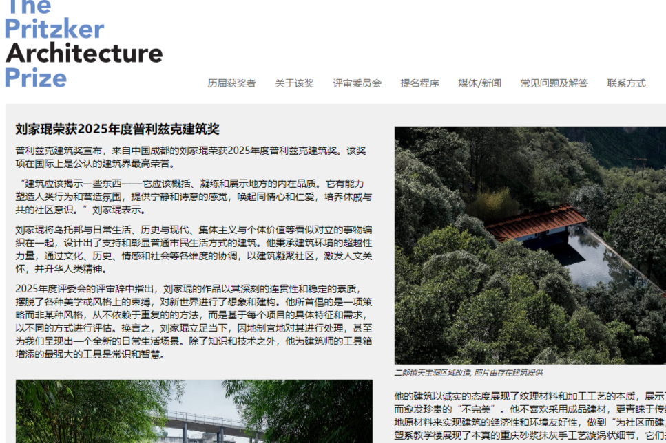 2025年,成都籍建筑師劉家琨成為繼王澍后第二位獲此殊榮的中國建筑師。