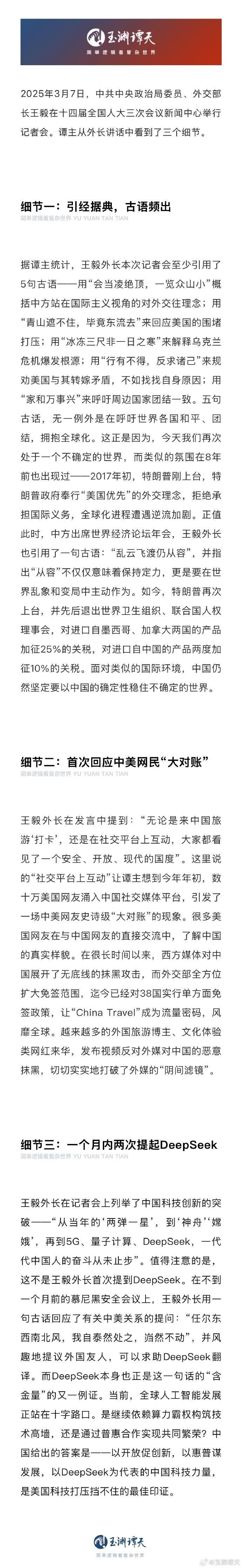 細(xì)節(jié)一:據(jù)譚主統(tǒng)計(jì),王毅外長(zhǎng)本次記者會(huì)至少引用了5句古語(yǔ),無(wú)一例外是在呼吁世界各國(guó)和平、團(tuán)結(jié),擁抱全球化。細(xì)節(jié)二:王毅外長(zhǎng)在發(fā)言中提到的“社交平臺(tái)上互動(dòng)”讓譚主想到今年年初中美網(wǎng)友史詩(shī)級(jí)“大對(duì)賬”的現(xiàn)象。細(xì)節(jié)三:王毅外長(zhǎng)在記者會(huì)上列舉中國(guó)科技創(chuàng)新的突破時(shí)提到了DeepSeek。而在不到一個(gè)月前,王毅外長(zhǎng)在慕尼黑安全會(huì)議上也提到了DeepSeek。