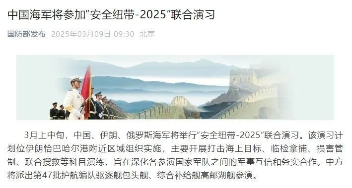 據(jù)國防部發(fā)布微信公眾號消息,3月上中旬,中國、伊朗、俄羅斯海軍將舉行“安全紐帶-2025”聯(lián)合演習(xí)。該演習(xí)計(jì)劃位伊朗恰巴哈爾港附近區(qū)域組織實(shí)施,主要開展打擊海上目標(biāo)、臨檢拿捕、損害管制、聯(lián)合搜救等科目演練,旨在深化各參演國家軍隊(duì)之間的軍事互信和務(wù)實(shí)合作。中方將派出第47批護(hù)航編隊(duì)驅(qū)逐艦包頭艦、綜合補(bǔ)給艦高郵湖艦參演。