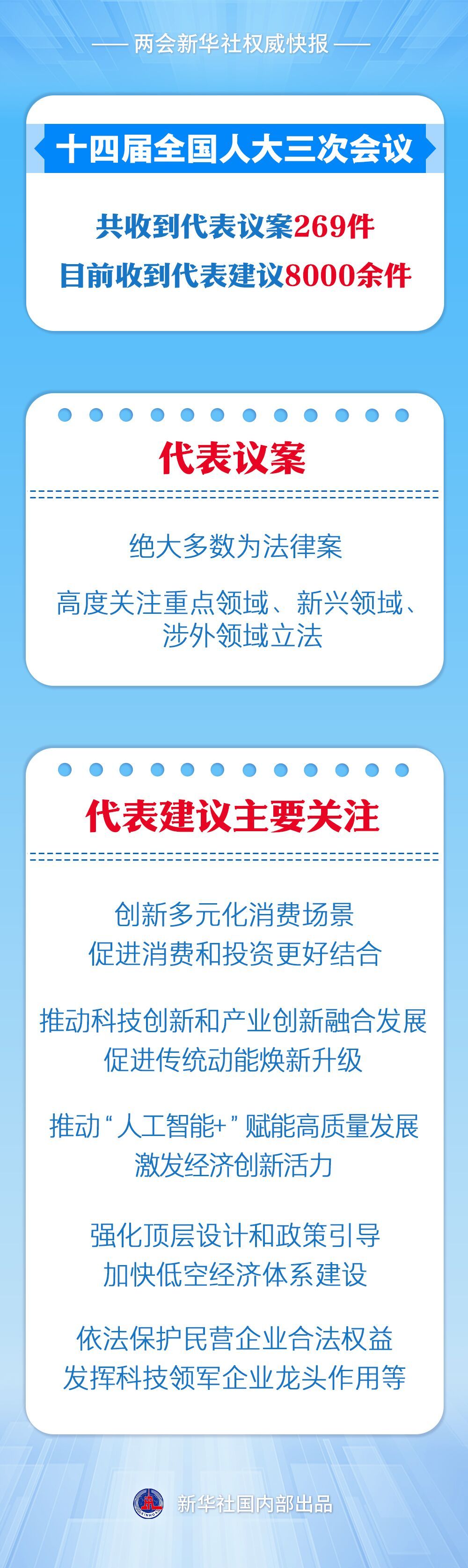 根據(jù)十四屆全國人大三次會議主席團決定的代表提出議案的截止時間,到3月8日12時,十四屆全國人大三次會議秘書處共收到代表議案269件。此外,目前大會秘書處已收到代表建議8000余件。