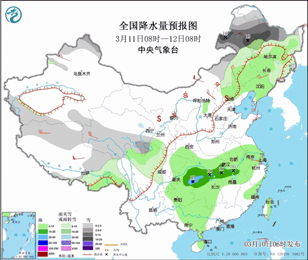 除了降溫和大風(fēng)沙塵天氣,本周兩股冷空氣還會給中東部帶來大范圍雨雪。11日夜間起,東北地區(qū)將迎來大范圍雨雪,內(nèi)蒙古東部、黑龍江西部和北部等地可能出現(xiàn)大雪到暴雪,新增積雪深度可達(dá)5至25厘米;同時南方降雨也會明顯增多增強(qiáng),江南大部以穩(wěn)定性降雨為主,華南需警惕強(qiáng)對流天氣。