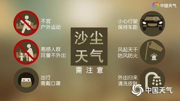 沙塵天氣對人體健康、交通出行等方面有不利影響。建議上述地區(qū)公眾在沙塵來臨時盡量減少外出,如果必須外出,應(yīng)佩戴口罩、防風(fēng)鏡等用品,做好健康防護(hù),回家及時清洗面部和鼻腔;如果駕車出行,需打開車燈,保持距離,減速慢行。