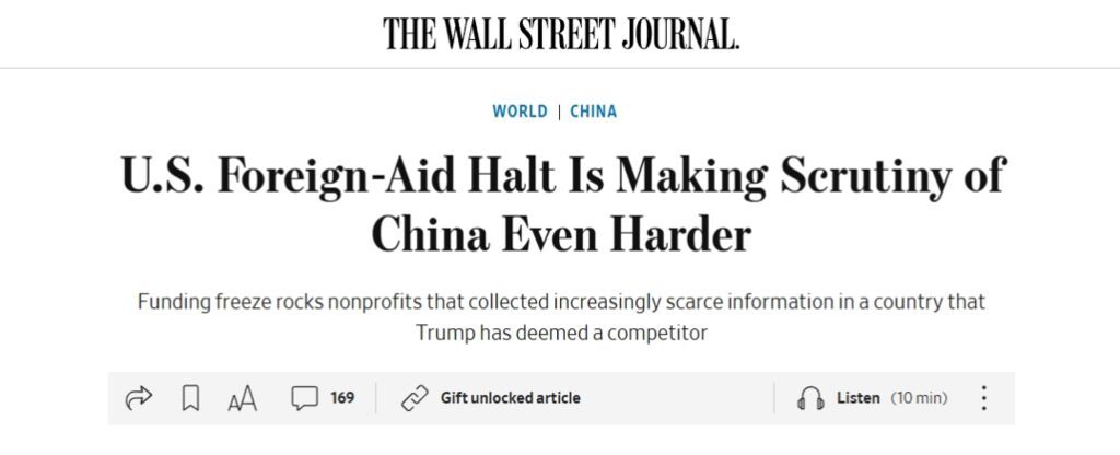澳大利亞戰(zhàn)略政策研究所近日在接受《華爾街日報》采訪時也證實,“美國暫停資助已導(dǎo)致該研究所停止了與中國相關(guān)的研究和數(shù)據(jù)項目,這些項目價值約120萬美元,重點關(guān)注網(wǎng)絡(luò)安全和技術(shù)問題”。