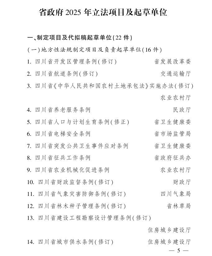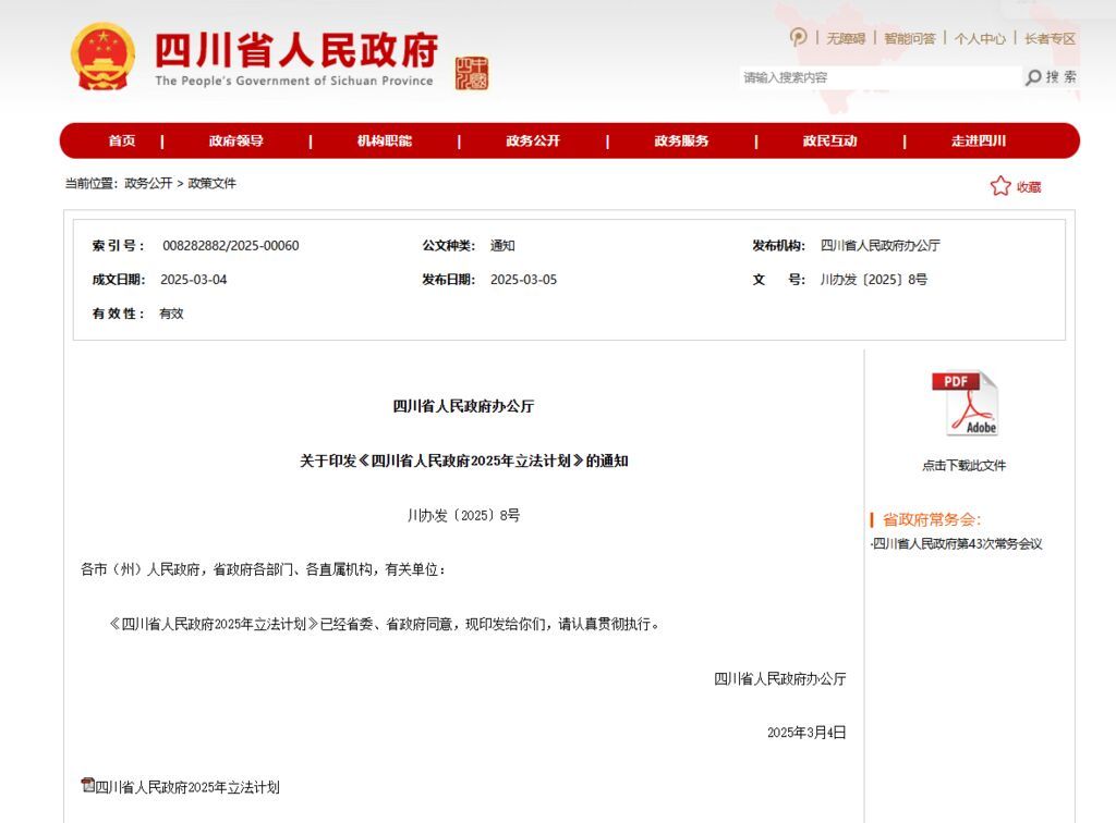立法計(jì)劃是安排布置年度政府立法任務(wù)的重要文件。日前,四川省人民政府辦公廳印發(fā)《四川省人民政府2025年立法計(jì)劃》。