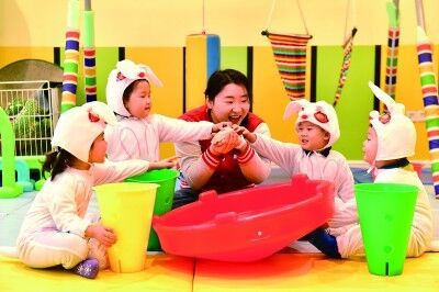 在山東省日照市東港區(qū)一家托幼園,老師陪伴孩子做游戲。新華社發(fā)