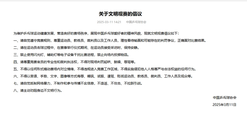 ·中國(guó)乒乓球協(xié)會(huì)發(fā)布文明觀賽倡議,呼吁理性看待輸贏。
