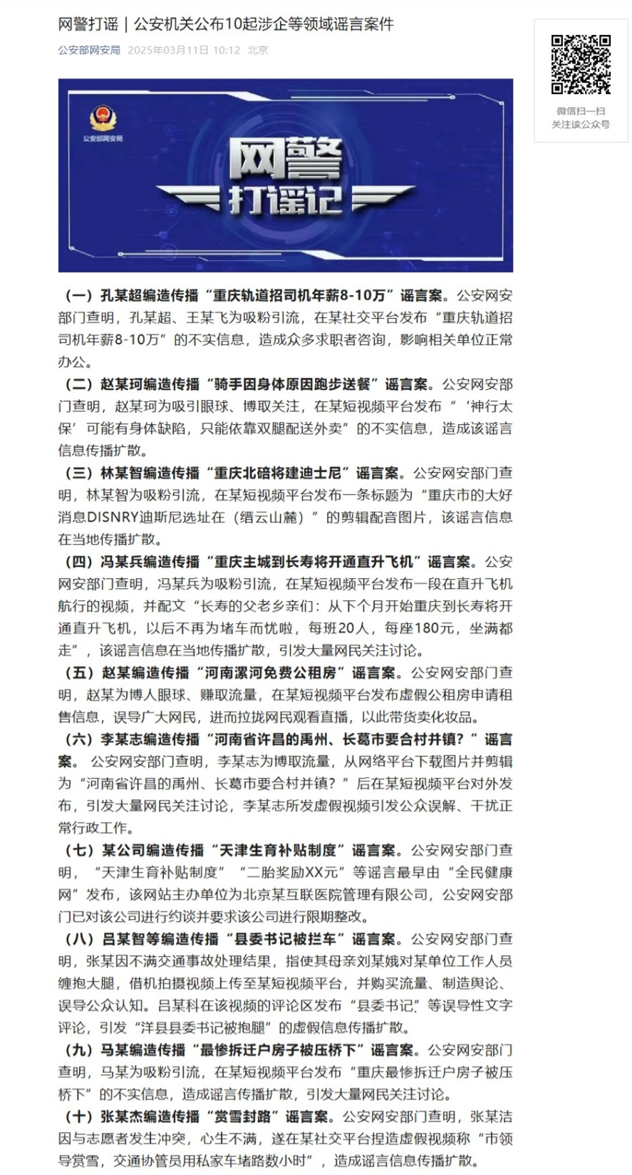 ·公安機(jī)關(guān)公布10起涉企等領(lǐng)域謠言案件。